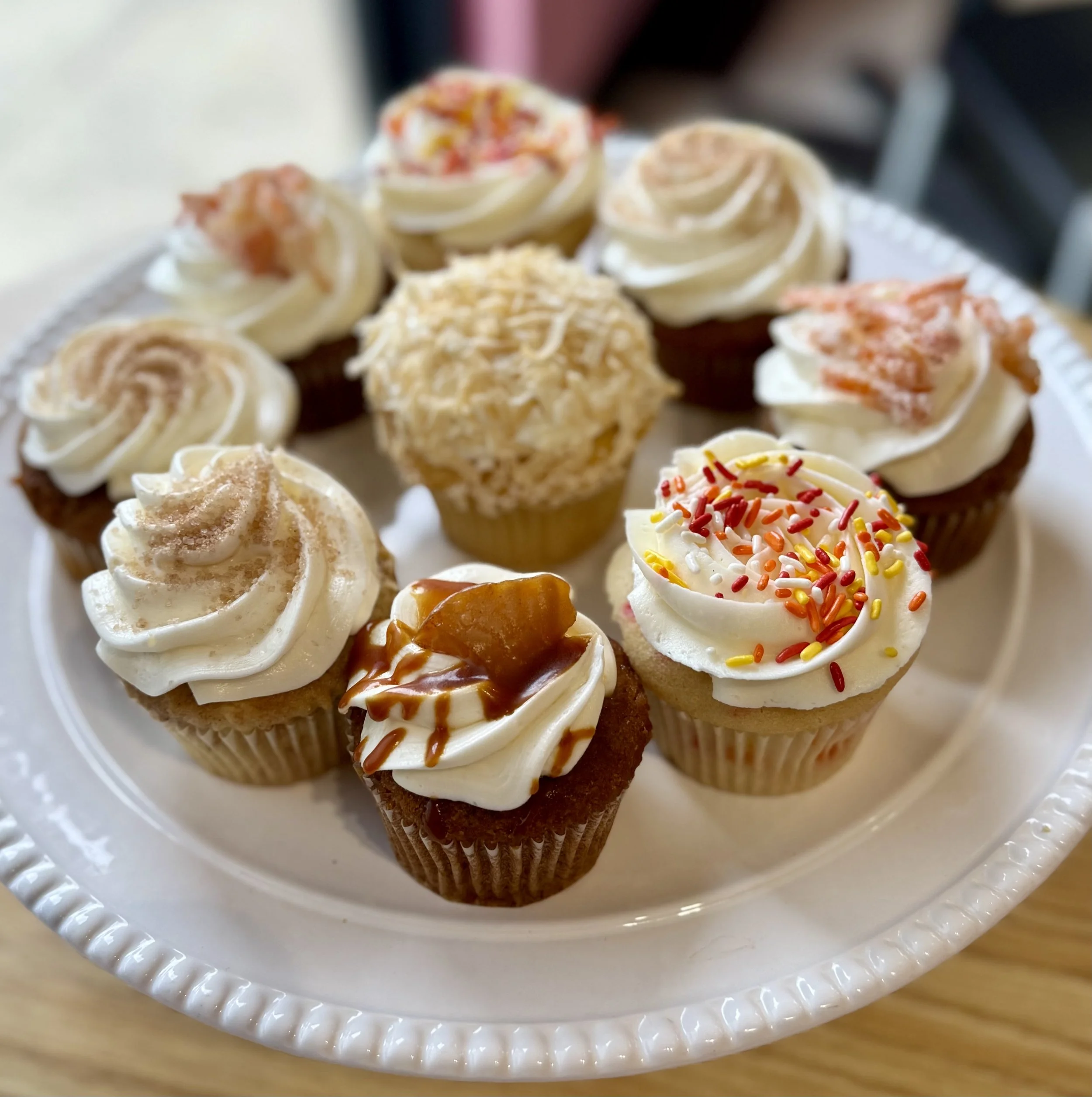 Pumpkin with Cream Cheese Frosting, Caramel Apple, Cinnamon Swirl, Fall-fetti, Toasted Coconut Chai, and Pumpkin Cheesecake. Plus our delicious Carrot Cake, always in season.